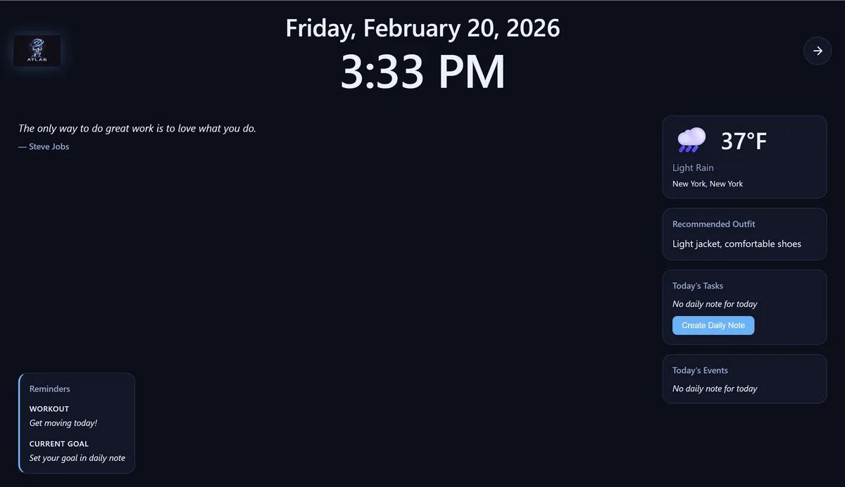 Atlas includes a personal CRM to track everyone in your network—colleagues, clients, friends, and organizations. Record notes about people, track interactions, and visualize relationships in an interactive graph. Connect your Google Calendar to sync events into daily notes, giving Atlas awareness of your schedule. The dashboard shows upcoming meetings, overdue tasks, and reminders at a glance. Never forget a commitment or lose context on an important relationship.